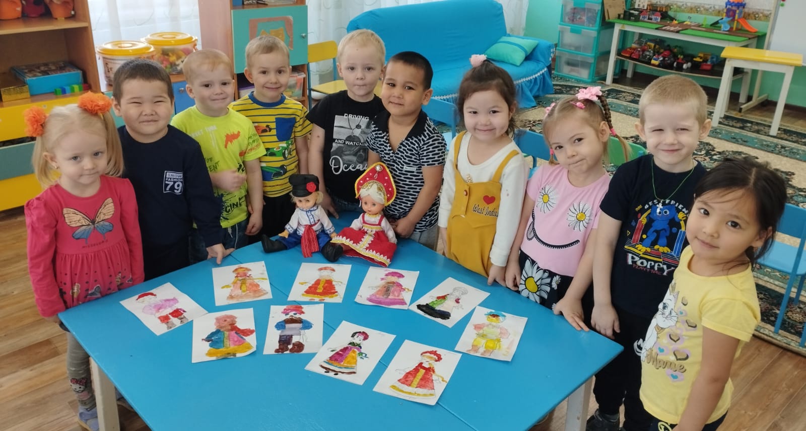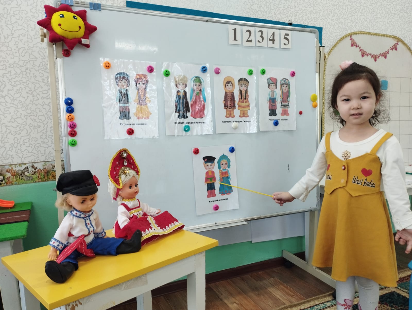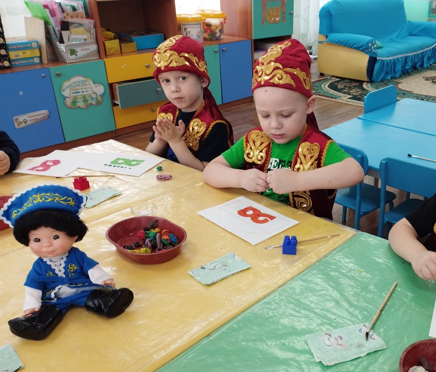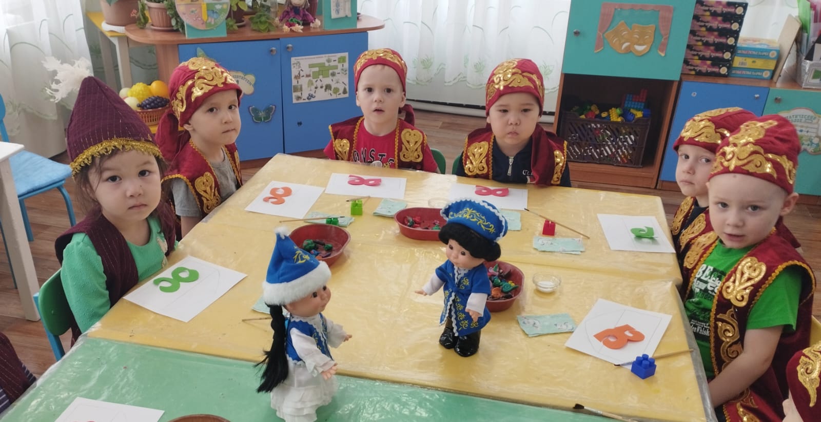 Вспомнили, какие мы знаем и познакомились с новыми сказками, потешками, народными песнями (колыбельными), с русскими и казахскими национальными инструментами. Украсили русские костюмы и казахский головной убор (тюбитейка).