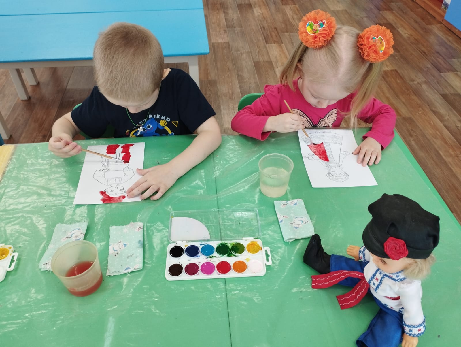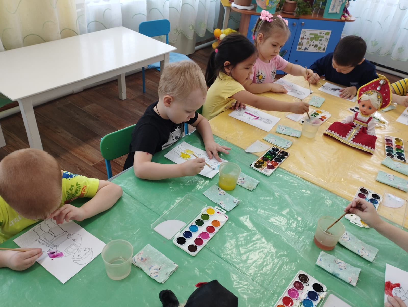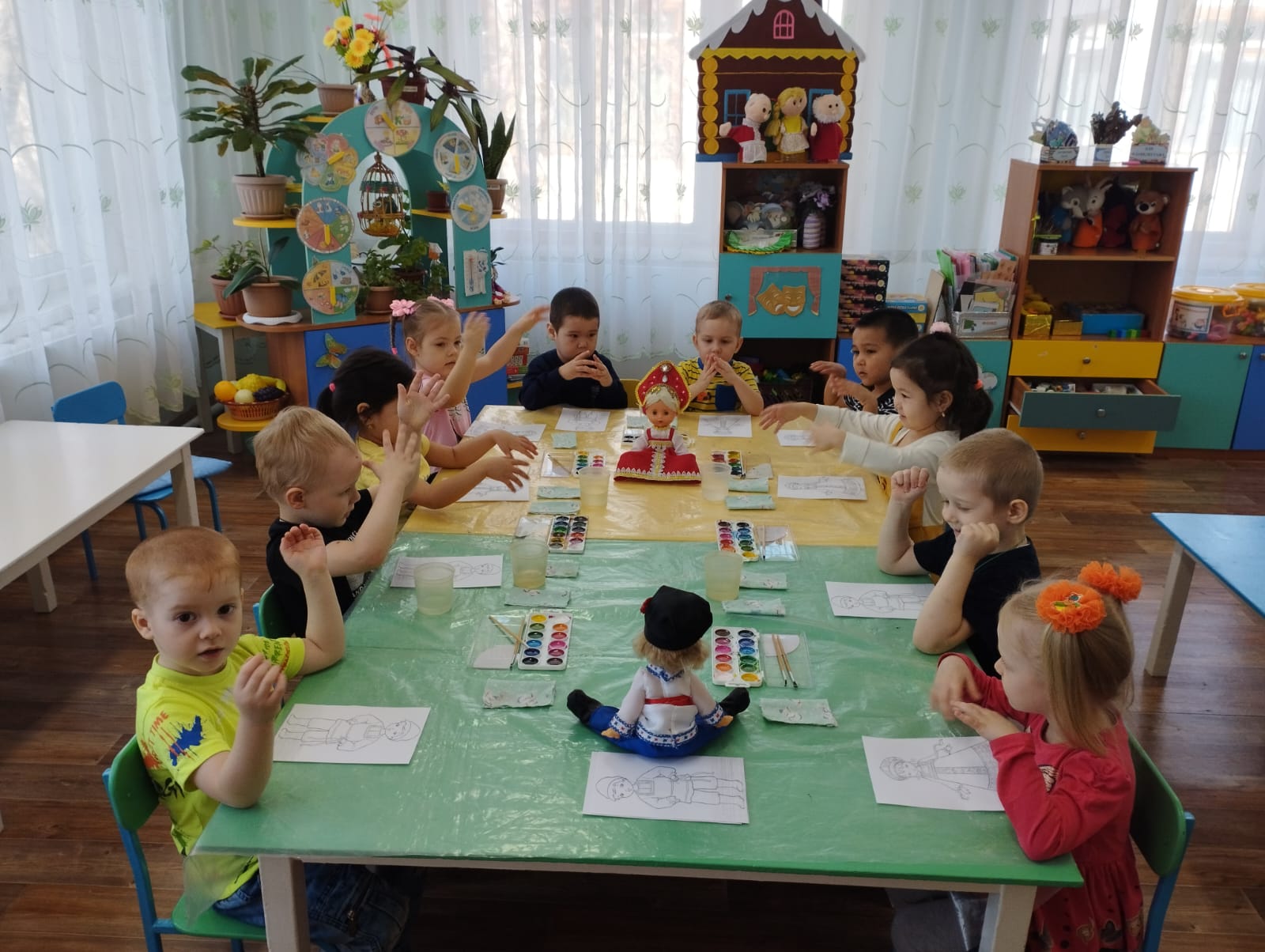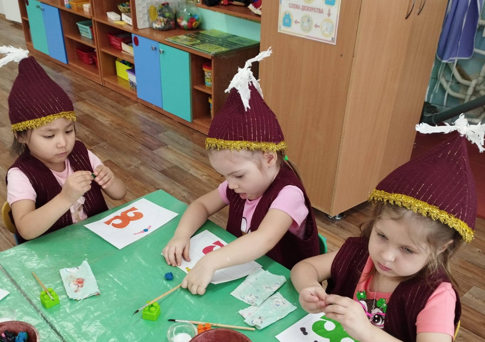 Вспомнили, какие мы знаем и познакомились с новыми сказками, потешками, народными песнями (колыбельными), с русскими и казахскими национальными инструментами. Украсили русские костюмы и казахский головной убор (тюбитейка).