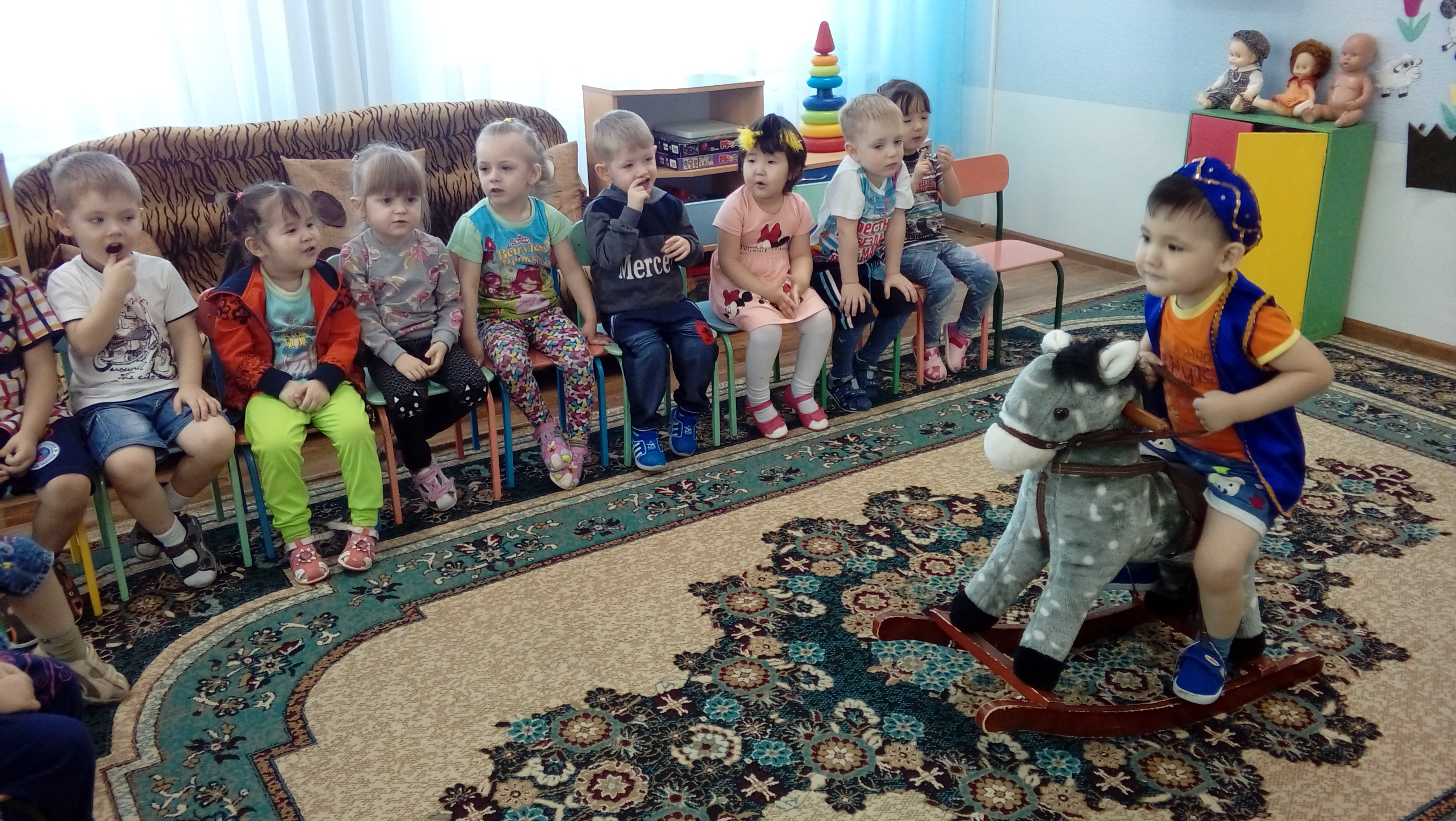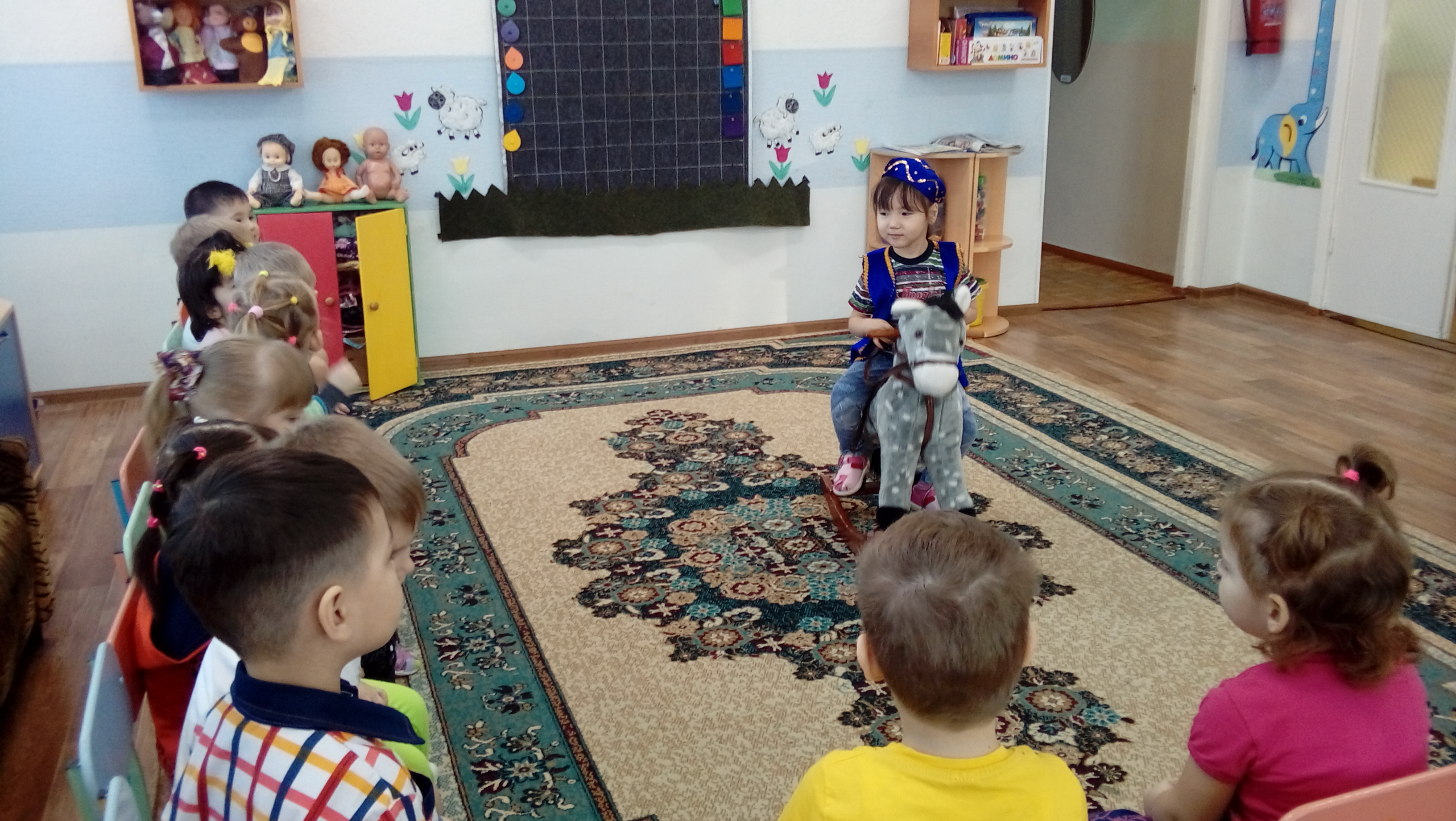Задачи: Учить детей правильному произношению звука–И- ( в звукосочетаниях, в словах), регулировать высоту голоса. Вызвать радость от повторения знакомого стихотворения и желание читать его вместе с воспитателем громко, выразительно; воспитывать интерес к представителям животного мира Казахстана