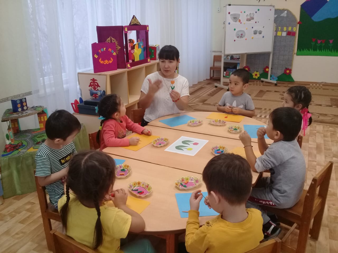 Задачи: Закреплять умение преобразовывать листы бумаги, формируя из них комочки; собирать композиции, создавая разные образы; развивать умение приклеивать к основной форме детали (глазки, рожки). Расширять представления о домашних животных Казахстана |